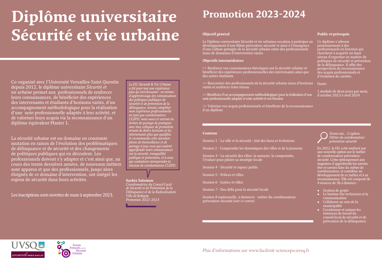 Créé en partenariat avec l’Université Versailles Saint-Quentin (UVSQ), le diplôme universitaire Sécurité et Vie Urbaine participe au développement d’une filière prévention-sécurité et à l’émergence d’une culture partagée de la sécurité urbaine entre des professionnels issus de domaines d’intervention variés.