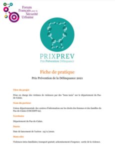 Le jury salue une action destinée à un public particulièrement vulnérable : les femmes et les enfants victimes de violences conjugales et/ou intrafamiliales. Il souligne la dimension originale de cet accompagnement des victimes et son caractère très concret. Le porteur a su mobiliser un partenariat dense à la fois auprès des partenaires institutionnels de la sécurité et auprès d’acteurs privés (des compagnies de taxis). Le jury soutient cette expérimentation ; la mobilité est un axe de travail d’une stratégie de prévention des violences faites aux femmes et intrafamiliales.